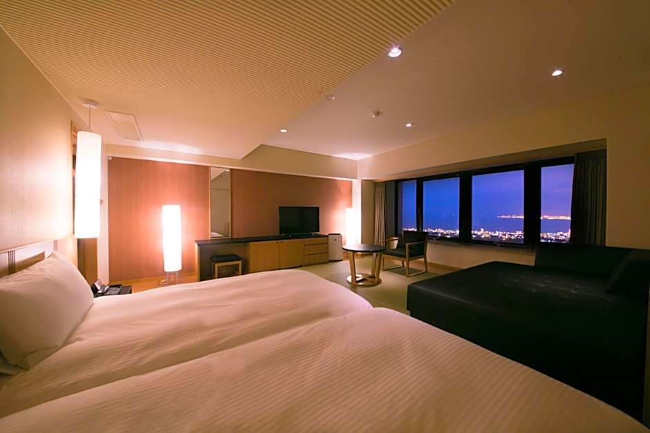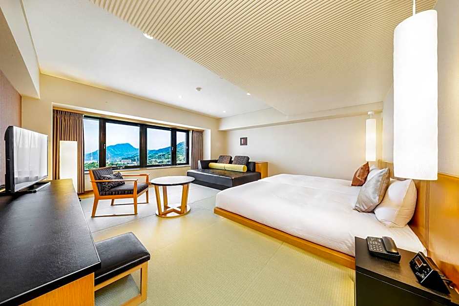 The family room includes a private bathroom, well-fitted with a bath, a shower, a bidet, a hairdryer and slippers. The spacious air-conditioned family room offers a flat-screen TV with satellite channels, a washing machine, tatami, a wardrobe as well as sea views. The unit has 2 beds and 3 futons.